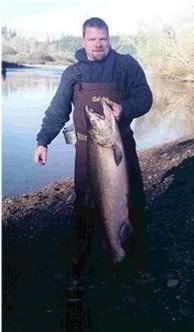 No 70+ pounders for me. This is the biggest one I'll claim, I've caught bigger boots in the same river. No scale, it was a heavy fish, especially after carrying it, a silver, 2 jacks and the kitchen sink about a mile to my car. I'm 6' and the tail is about 1/2" off the ground. 15# line, 12# leader. Not the best picture, it was in partial shade with a disposable camera. Largest silver around 20# Steelhead-19# hatchery summer run, Wynoochee River 1990. I have a pic somewhere and will post it if I can find it. You will laugh at the mullet.